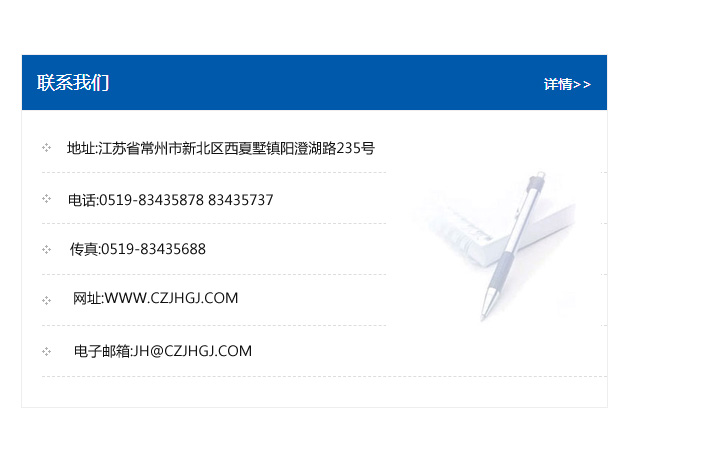 地址:常州市新北區友邦商務大廈1幢16、17層  電話:0519-85101652  傳真:0519-85112595  郵編:213022  網址:www_cz-jiayue_cn.wmlengku.com  郵箱:xiajifengaa@163.com